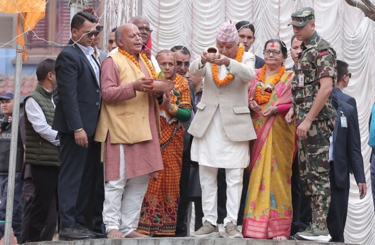 President Paudel visits Gaurighat to worship Chhathi Mata