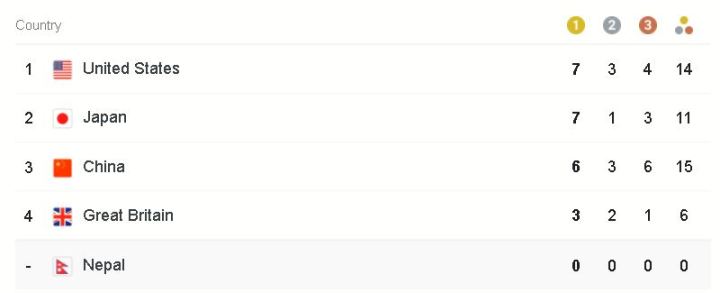 अमेरिका र जापानले सात/सात स्वर्ण पदक जितेका छन् । अमेरिकाले सात स्वर्ण, तीन रजत र चार कास्यसहित १४ पदक जितेको छ । त्यस्तै जापानले सात स्वर्ण, एक रजत र तीन कास्य पदकसहित ११ पदक जितेको छ ।